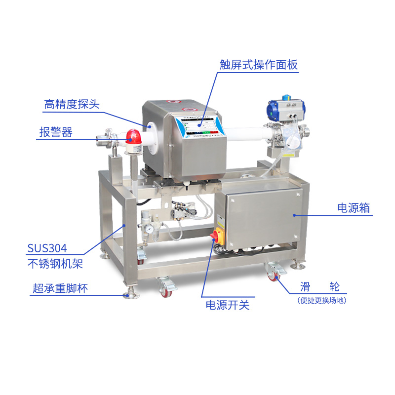 液态、半流体等只要能通过管道传送的产品金属检测,用于检测各类液体如:糖水、油料、酱料、果汁等原料在生产加工过程中混入的金属