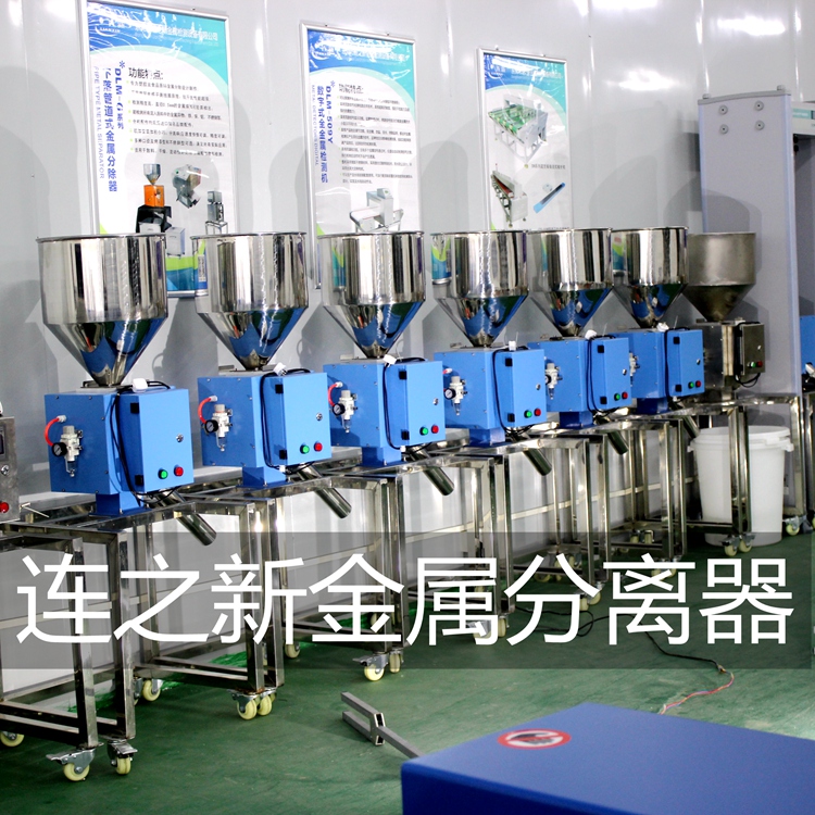 原料从料斗或送料器自由下落进入金属分离器,如果没有金属杂质,原料会直接通过金属分离器流向下端的出料口。如果检测器检测到原料中含有金属,那么控制器立刻启动分离板将金属物和部分原料一起导向侧面的排料口,然后分流板迅速恢复至正常的位置,分流板速度可调,金属分离器的检测精度也可根据生产需要调节,最小可检测并分离出Φ 0.2mm的金属颗粒。